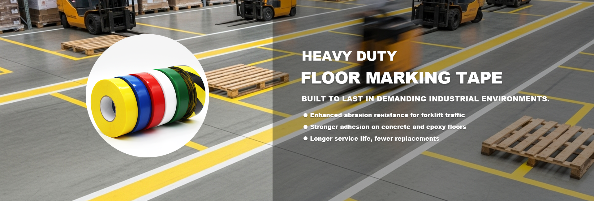 Heavy-duty floor marking tapes resistant to forklift traffic, ideal for 5S organization and area zoning.